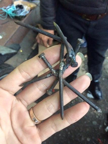 Theo anh An, những chiếc “đinh chùm” này được cấu tạo từ 5 chiếc đinh đơn lẻ hàn với nhau. Mỗi chiếc đinh trên chùm được xoay theo một hướng khác nhau. Xe máy hay ô tô dính phải loại đinh này rất dễ bị thủng săm, lốp.