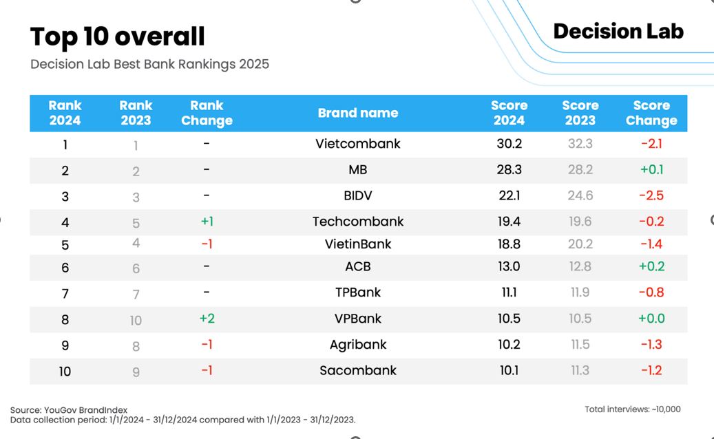 Bảng xếp hạng Ngân hàng Tốt nhất của Decision Lab hàng năm được xây dựng dựa trên chỉ số thương hiệu YouGov BrandIndex, một công cụ đo lường sức khỏe thương hiệu qua các yếu tố như Ấn tượng, Chất lượng, Giá trị, Hài lòng, Đề xuất và Danh tiếng. Các ngân hàng được xếp hạng dựa trên điểm số tổng hợp từ các yếu tố này, phản ánh mức độ nhận diện và tin tưởng của khách hàng vào ngân hàng. Bảng xếp hạng giúp đánh giá các ngân hàng hàng đầu và xu hướng cải thiện thương hiệu trong từng năm. Thông tin tham khảo thêm tại đây: https://www.decisionlab.co/best-bank-rankings-2025.