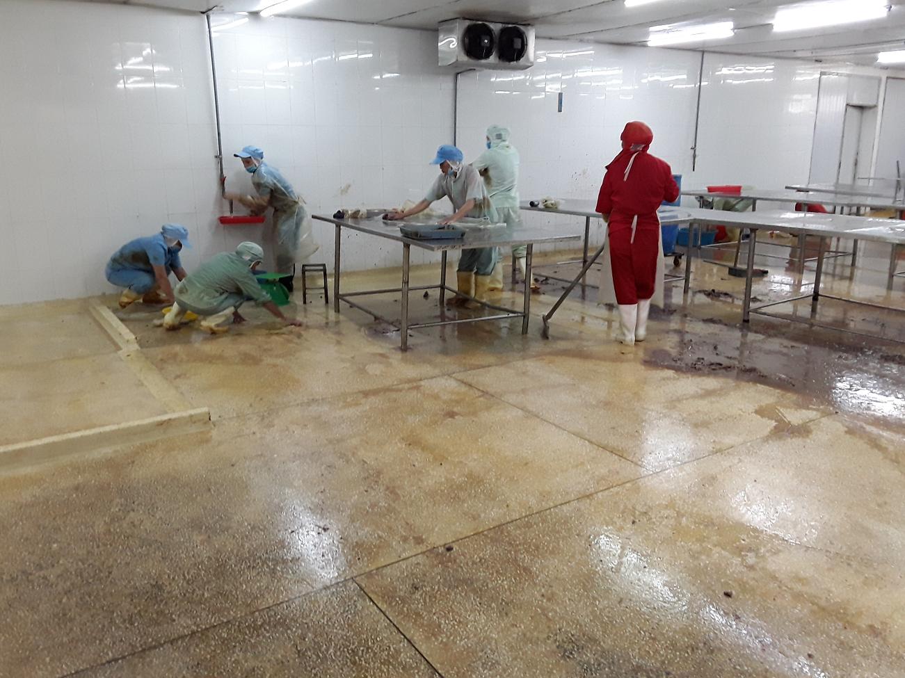 Tại công đoạn chế biến cá sọc, công ty trang bị bàn có gờ cao xung quanh, vụn cá bị chặn lại, không rơi xuống đất. Số lượng bàn hiện tại chuyển qua xưởng gia công tôm sử dụng, giảm chi phí đầu tư công cụ dụng cụ cho xưởng này. Bên cạnh đó, công ty cũng cho thi công lại hệ thống ống cống, nâng cao độ dốc đường ống để giảm tích tụ rác, nước thoát nhanh hơn. Đồng thời, gắn thêm các lọc ở miệng hố để ngăn chặn xác cá đi xuống hồ nước thải.