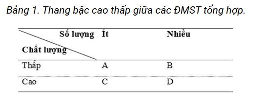 Thứ ba, sự so sánh về thang bậc cao thấp giữa các ĐMST tổng hợp (đối với dạng 2 và 3). ĐMST tổng hợp có 2 mặt là số lượng và chất lượng. Số lượng là nhiều hay ít các loại ĐMST thuộc các dạng ĐMST. Chất lượng thể hiện ở: tính chất (đột phá hay tuần tự), độ lan tỏa (rộng hay hẹp), mức độ tồn tại (bền vững hay không bền vững), mức độ phát triển (liên tục hay ngắt quãng), phạm vi (rộng hay hẹp); lĩnh vực kinh tế (quan trọng hay không quan trọng)... Nhìn chung, thang bậc giữa các ĐMST tổng hợp tăng lên theo chiều (A) => (B), (C) => (D) (bảng 1). Đồng thời, do có nhiều mức độ về số lượng và chất lượng ĐMST nên cũng có nhiều mức độ khác nhau giữa các ĐMST tổng hợp.