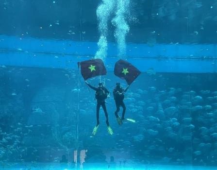 Đặc biệt, tại Thủy cung, du khách không khỏi tự hào và phấn khích khi được chào đón Tết Độc lập theo phong cách đại dương độc đáo. Khoảnh khắc các thợ lặn phất cao lá cờ Tổ quốc tại bể chính của Thủy cung khiến nhiều du khách vỡ òa vì bất ngờ.