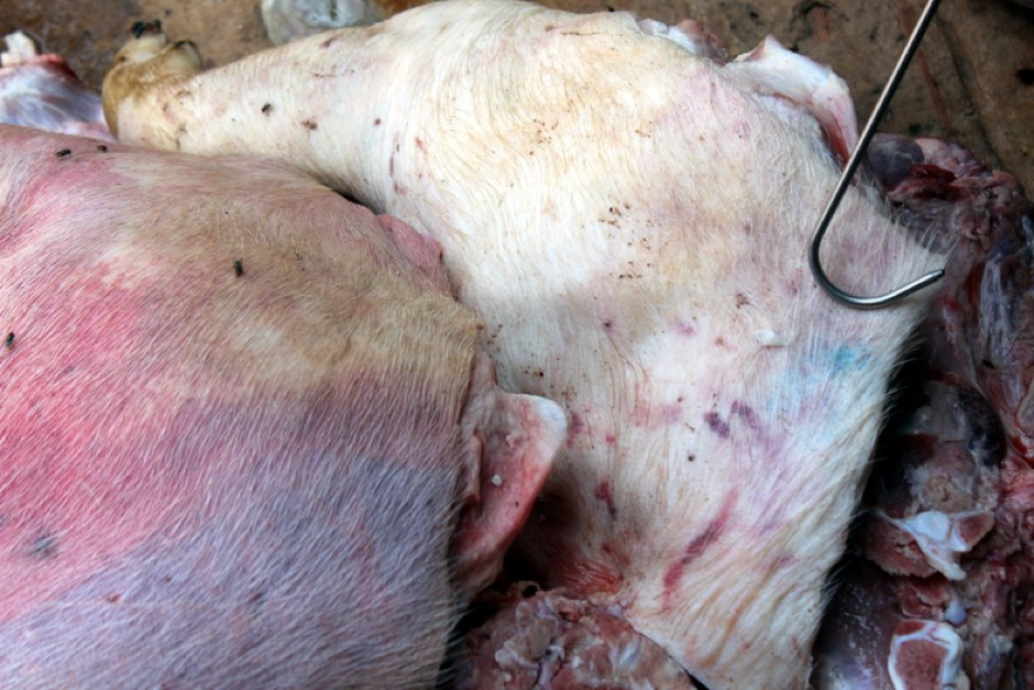 Qua kiểm tra, Đoàn ghi nhận hơn 1,7 tấn thịt lợn đang để vung vãi dưới sàn nhà của cơ sở. Đáng nói, phần lớn thịt lợn tại cơ sở đã biến đối màu tím tái, thậm chí đã bốc mùi hôi thối. Ngoài ra, trong một ô-tô tải chứa 2 thùng xốp thịt lợn cũng đã đổi màu tím tái.