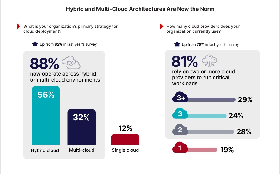 Khảo sát cho thấy 88% các tổ chức hiện đang hoạt động trong môi trường đám mây lai hoặc đa đám mây, tăng so với 82% trong báo cáo năm ngoái. Trong số đó, 81% dựa vào hai hoặc nhiều nhà cung cấp đám mây để chạy các khối lượng công việc quan trọng.