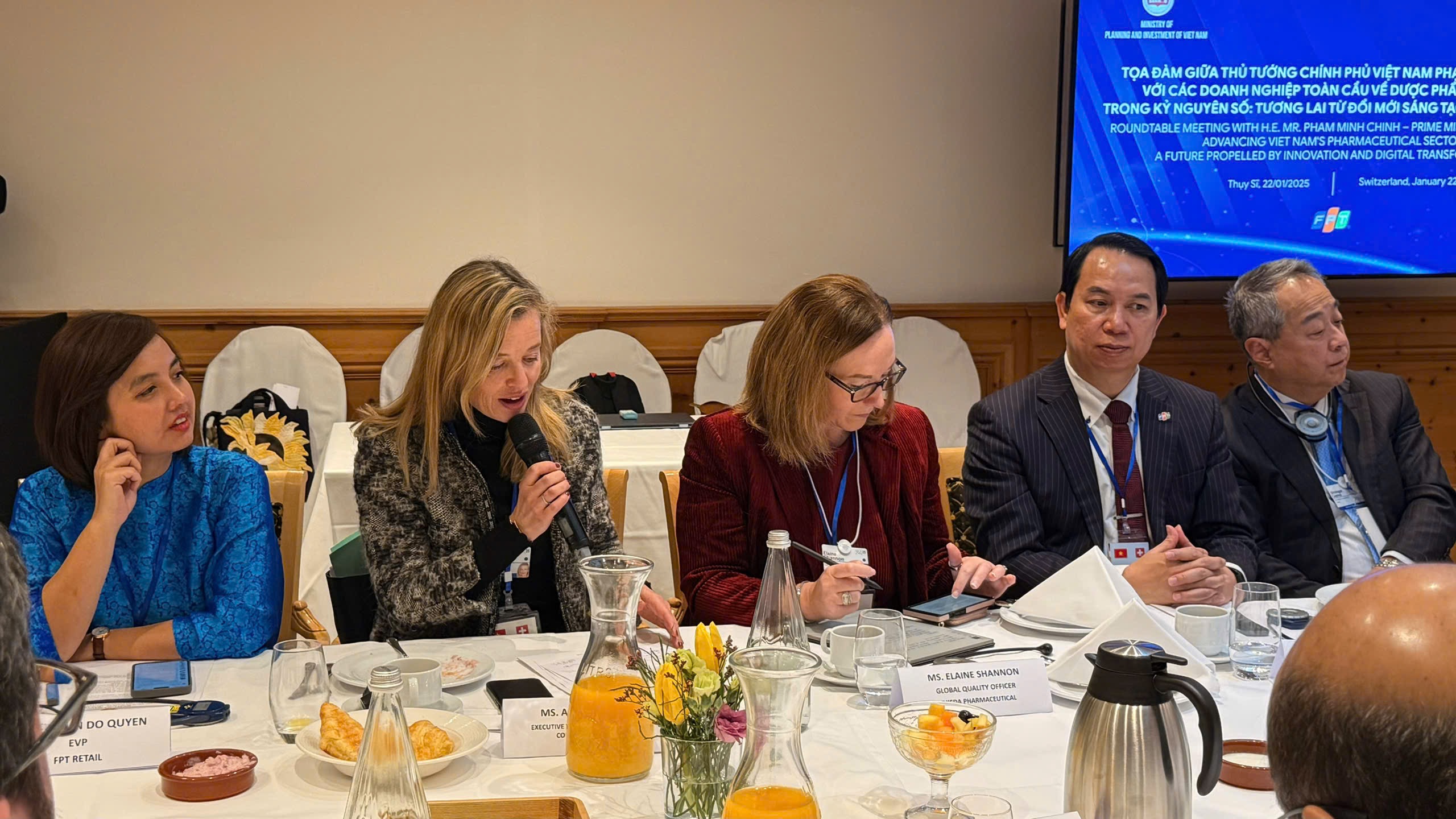 (VietQ.vn) - Ngày 22/1 (theo giờ địa phương), tại Davos, Thụy Sĩ, trong khuôn khổ chuyến công tác tham dự Hội nghị Diễn đàn Kinh tế Thế giới (WEF), Đoàn đại biểu cấp cao Việt Nam đã tham dự Tọa đàm với các tập đoàn dược phẩm toàn cầu với chủ đề: "Dược phẩm Việt Nam trong kỷ nguyên số - Tương lai từ đổi mới sáng tạo và công nghệ”. Sự kiện do Bộ Kế hoạch và Đầu tư, Bộ Ngoại giao và Tập đoàn FPT phối hợp tổ chức.