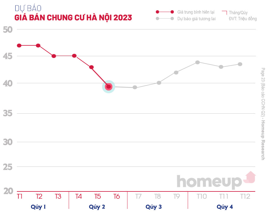 Giá chung cư nội đô từ đầu năm rơi vào khoảng 35 đến 48 triệu đồng/m2; hiện tại khoảng trung bình giá 39,4 triệu đồng/m2; dự báo giá sẽ tăng dần lên trong quý 3/2023 và có thể lên đến khoảng 45 triệu đồng/m2 vào giữa quý 4/2023 và thời điểm này đang là thời điểm lý tưởng để xuống tiền mua căn hộ chung cư.