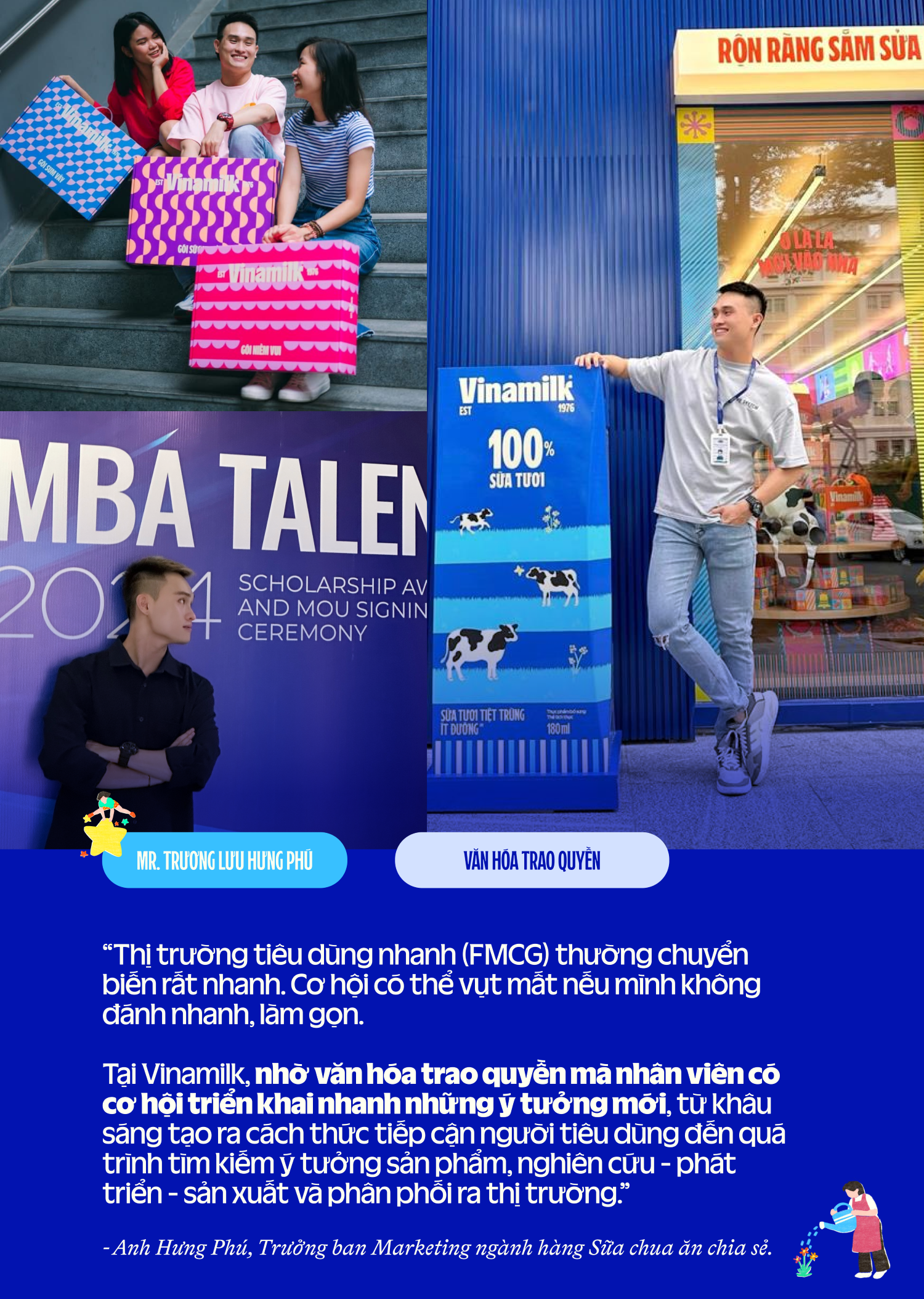 Nếu môi trường làm việc lý tưởng cho nhân viên mới là nơi thử nghiệm ý tưởng táo bạo, thì với nhân sự quản lý cấp trung, đó là nơi được trao quyền và cơ hội phát triển sự nghiệp. Điều này đã “giữ chân” Hưng Phú – Trưởng ban Marketing ngành hàng Sữa chua ăn – gắn bó với Vinamilk trong hơn 10 năm qua, một điều hiếm gặp trong lĩnh vực thường có tỷ lệ “nhảy việc” cao. Bắt đầu từ vị trí của một chuyên viên ngành hàng sữa nước, anh trải qua nhiều vị trí ở các ngành hàng khác nhau trước khi được trao quyền quản lý Marketing ngành hàng Sữa chua ăn - một trong những ngành hàng chủ lực của Vinamilk, với thị phần dẫn đầu thị trường nội địa.