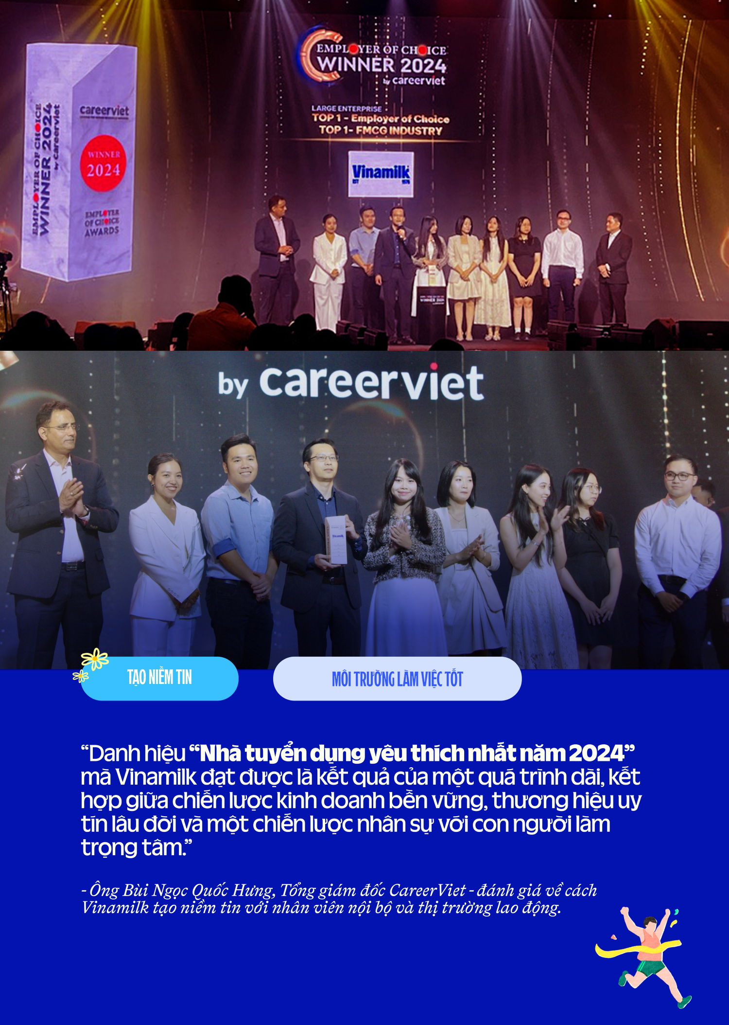 Theo đại diện CareerViet, chiến lược xây dựng thương hiệu tuyển dụng phải gắn kết chặt chẽ với chiến lược thương hiệu của doanh nghiệp. Bằng cách đổi mới cách tiếp cận, gia tăng trải nghiệm cho ứng viên, Vinamilk đã thành công truyền tải thông điệp nhất quán đến người lao động về một môi trường làm việc đề cao sự sáng tạo và tự chủ. Điều này lý giải lý do vì sao Vinamilk lần nữa giữ ngôi đầu bảng trong danh sách Nhà tuyển dụng yêu thích nhất năm 2024. Khác với nhiều giải thưởng về môi trường làm việc khác, bảng xếp hạng này không chỉ do nhân viên công ty bình chọn mà còn mở cho cộng đồng bên ngoài.
