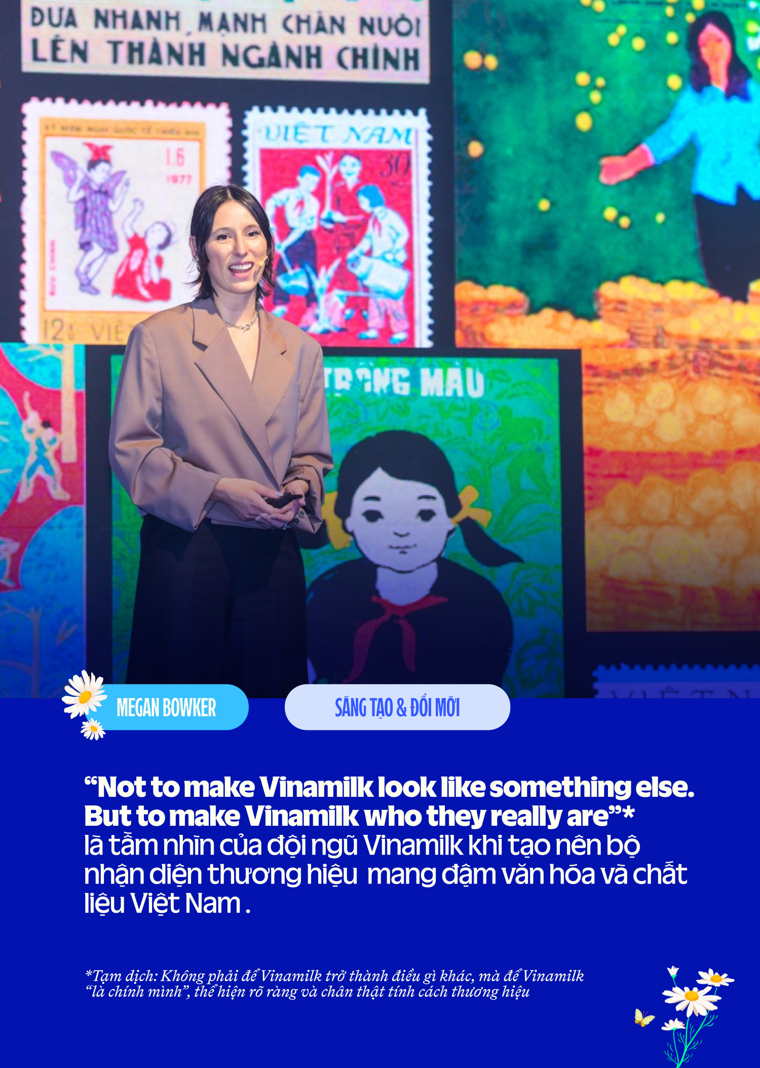 Bước ngoặt thay đổi nhận diện thương hiệu của Vinamilk trong năm 2023 và 2024 đã trở thành một case study thành công được đào sâu mổ xẻ không thiếu một khía cạnh nào. Kết quả “không tưởng” của Vinamilk đến từ bước đi táo bạo đầu tiên: Tuyển dụng một nhân sự quản lý về thiết kế và hình ảnh từ New York. Dẫn dắt đội ngũ sáng tạo hình ảnh của Vinamilk - Megan Bowker có vai trò tạo nên bộ nhận diện thương hiệu mang đậm văn hóa và chất liệu của một Việt Nam đang vươn ra thế giới.