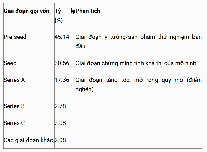 - Khó tiếp cận nguồn vốn đầu tư: Theo số liệu khảo sát, năm 2023, 83,46% doanh nghiệp gặp khó khăn trong tiếp cận nguồn vốn và 54,25% thiếu các kênh kết nối hiệu quả với nhà đầu tư. Điểm nghẽn Series A là vấn đề cấu trúc: gần 75,7% startup đang ở giai đoạn Pre-seed và Seed, trong khi tỷ lệ chuyển lên Series A chỉ là 17,36%. Điều này cho thấy hệ sinh thái mạnh về khởi tạo ý tưởng nhưng thất bại trong việc mở rộng quy mô (scaling up).
