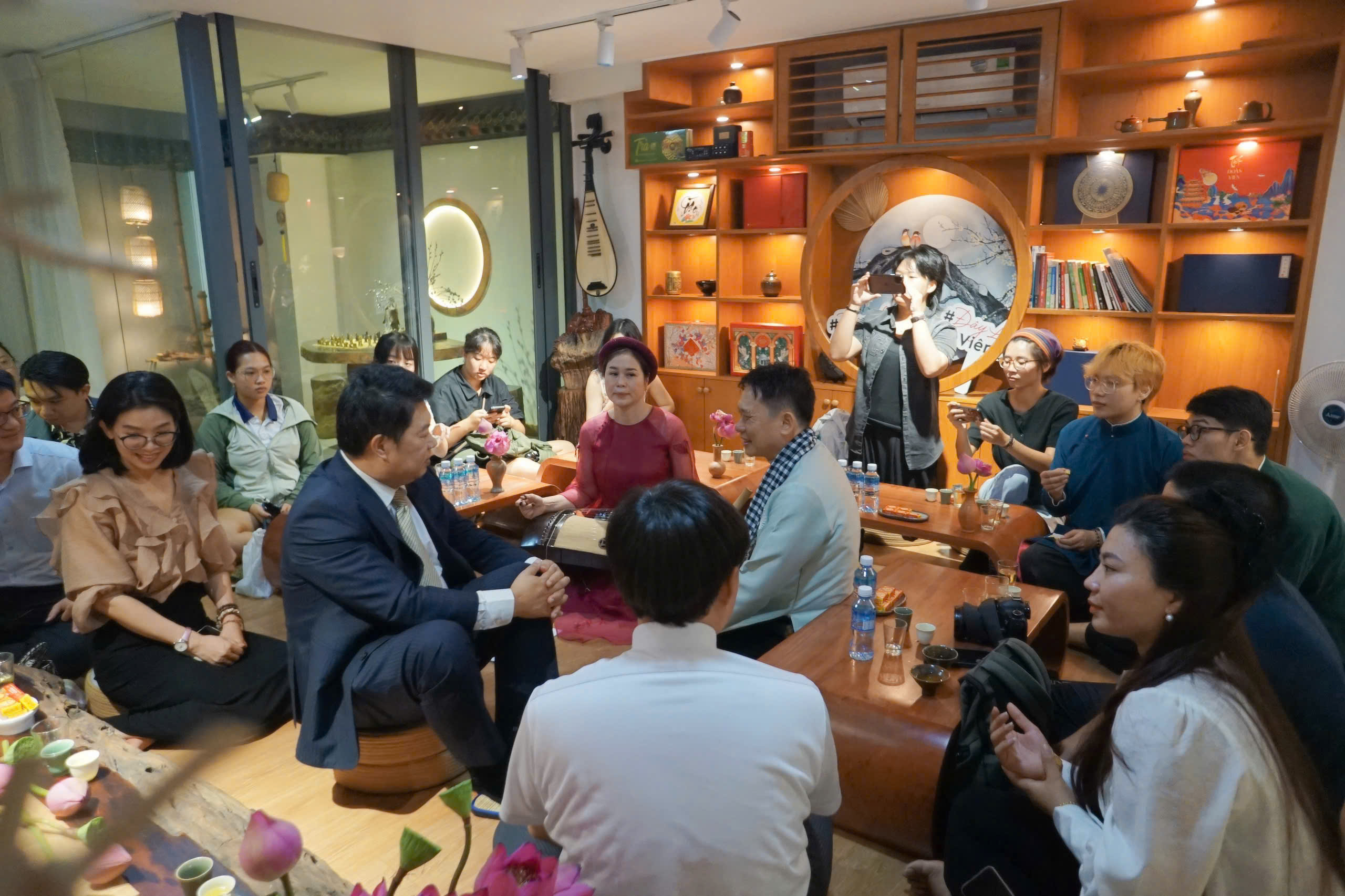 Bên cạnh những phần chia sẻ học thuật, khách mời còn được thưởng thức nghệ thuật pha trà, lắng nghe âm sắc sáo trúc, đàn tranh, guitar hóa quyện cùng hương trà, tạo nên một không gian vừa thanh tịnh vừa đậm chất Á Đông.