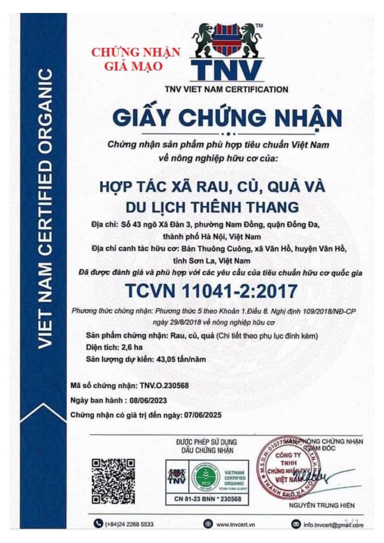 Vì vậy, giấy chứng nhận mà Hợp tác xã Rau, củ, quả và Du lịch Thênh Thang (mã số TNV.O.230568 cấp ngày 08/06/2023) đang sử dụng quảng bá trên các trang mạng xã hội và phương tiện thông tin đại chúng là giả mạo.