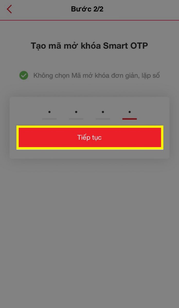 Bước 7: Tạo mã mở khóa Smart OTP, nhấn chọn “Tiếp tục”.