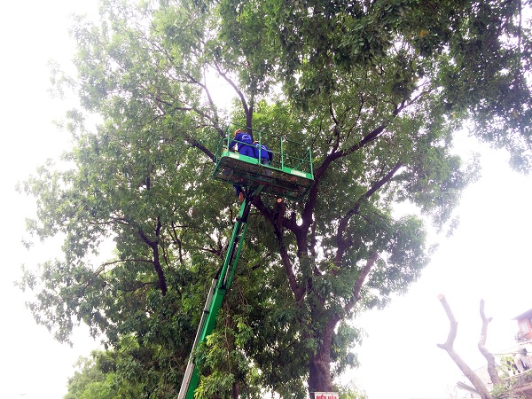 Để có thể chặt hạ, cắt tỉa các công nhân được đưa lên từ máy nâng. Ảnh: Lan Lan.