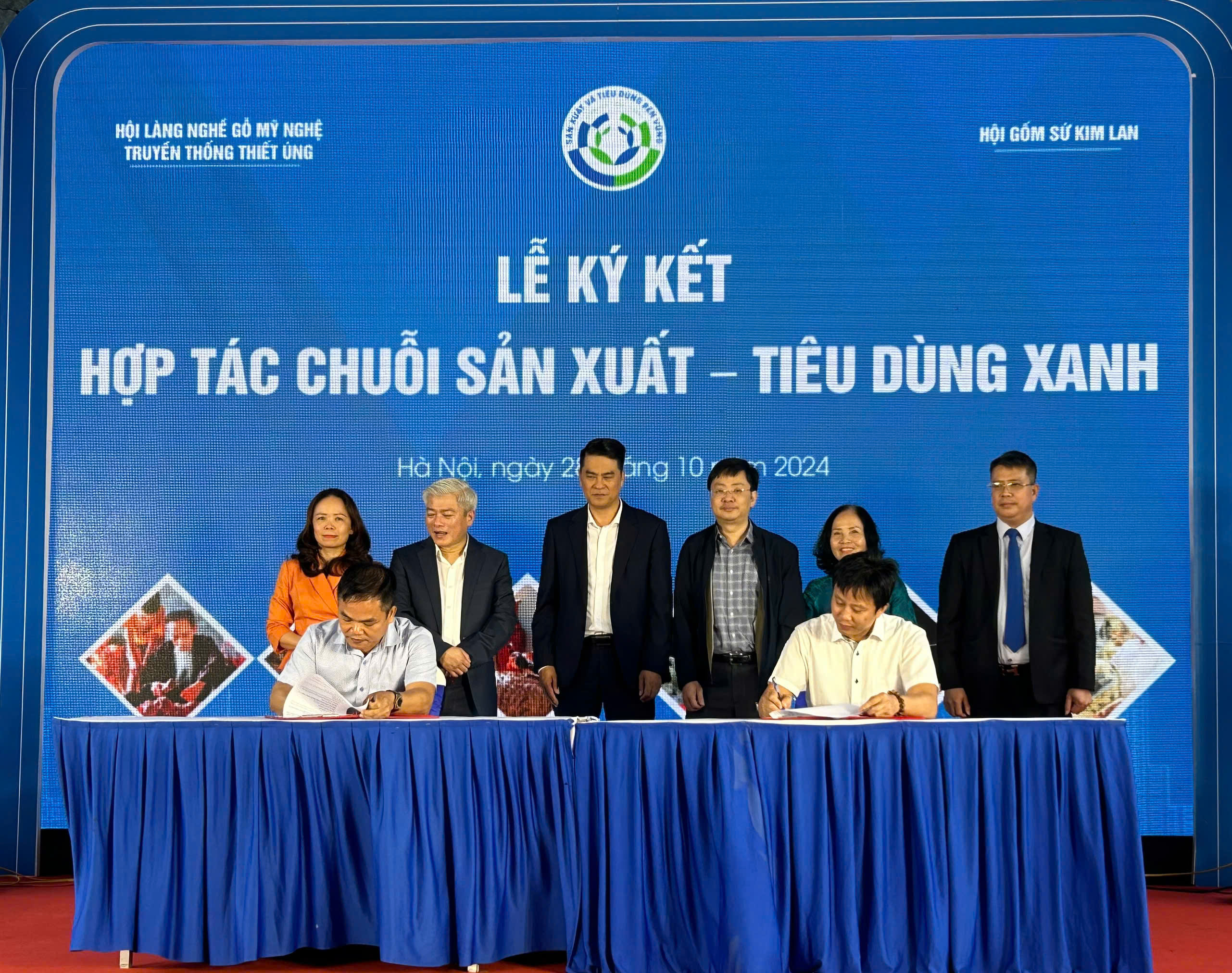 Ký kết hợp tác chuỗi sản xuất tiêu dùng xanh giữa Hiệp hội gốm sứ Kim Lan, huyện Gia Lâm và Hội làng nghề gỗ mỹ nghệ truyền thống Thiết Úng, xã Vân Hà, huyện Đông Anh (Hà Nội)