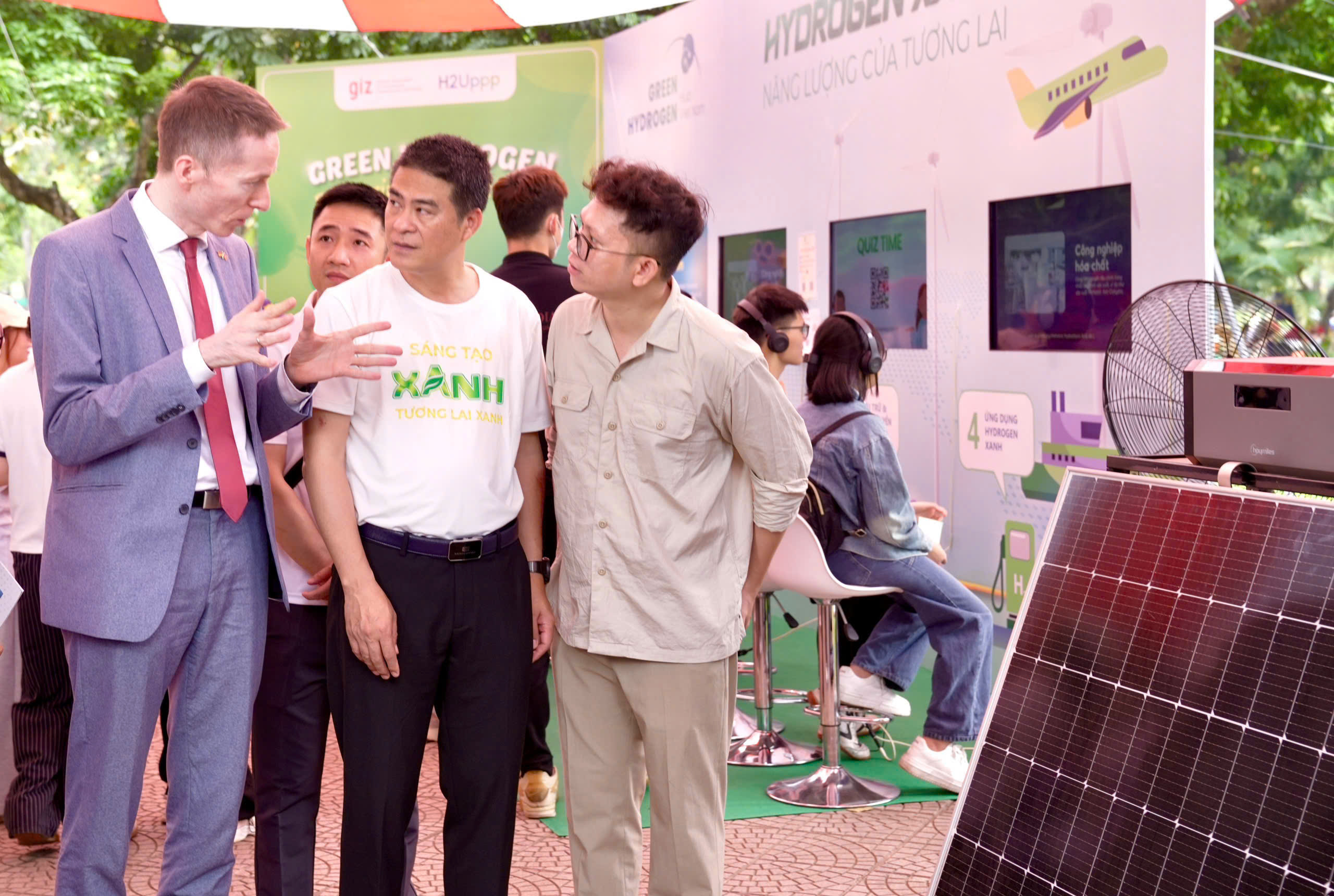Ông Michael Kratz – Tham tán Kinh tế và Ngoại giao Khí hậu, Đại sứ quán Cộng hòa Liên bang Đức tại Việt Nam (bên trái) trao đổi với Phó Giám đốc Sở Công Thương Hà Nội Nguyễn Đình Thắng (giữa) tại Lễ phát động .