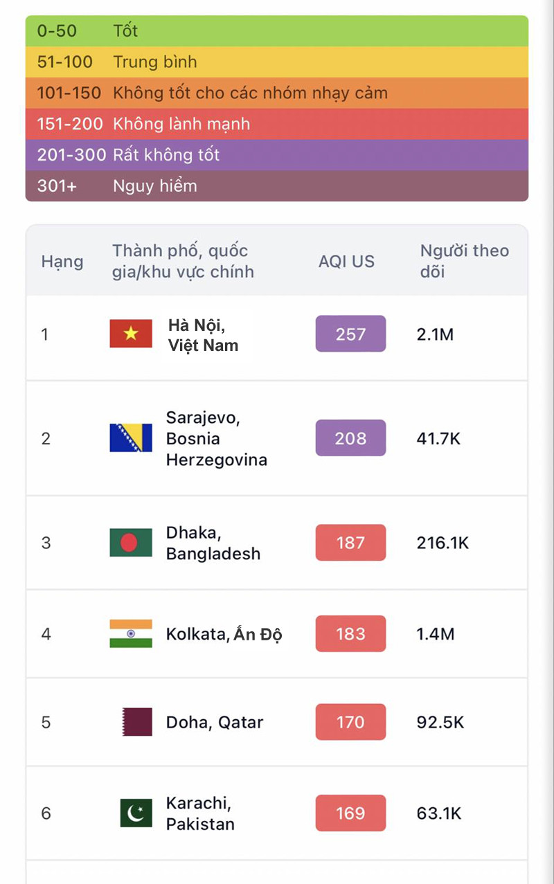 Ô nhiễm không khí tại Hà Nội ở mức báo động. Ảnh: IQAir.