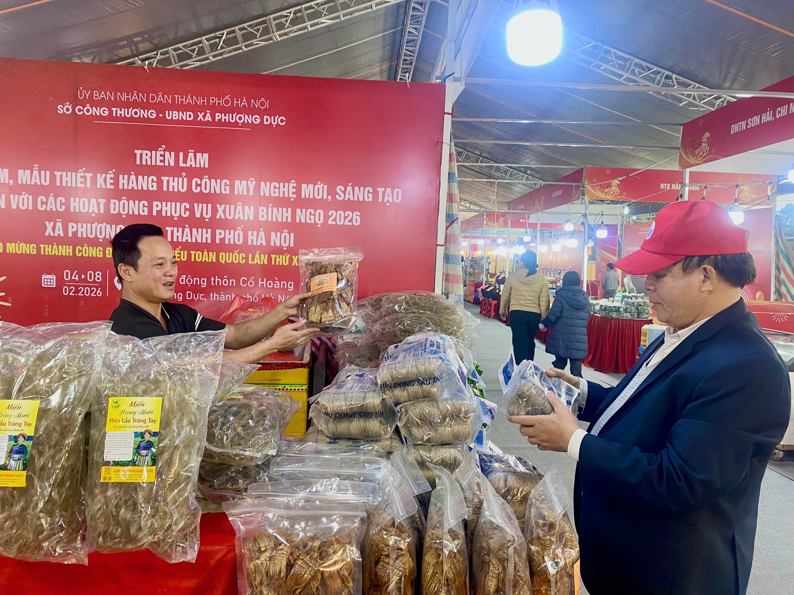 Tại Triển lãm, người dân xã Phượng Dực đã giới thiệu sản phẩm làng nghề tò he thôn Xuân La, mây tre đan thôn Lưu Thượng,…Đặc biệt, nhằm phục vụ nhu cầu mua sắm, tiêu dùng của người dân trong dịp Tết Bính Ngọ 2026, các doanh nghiệp đã mang đến Triển lãm các sản phẩm nông sản, OCOP: gạo, măng, miến, bánh chưng, giò chả,…