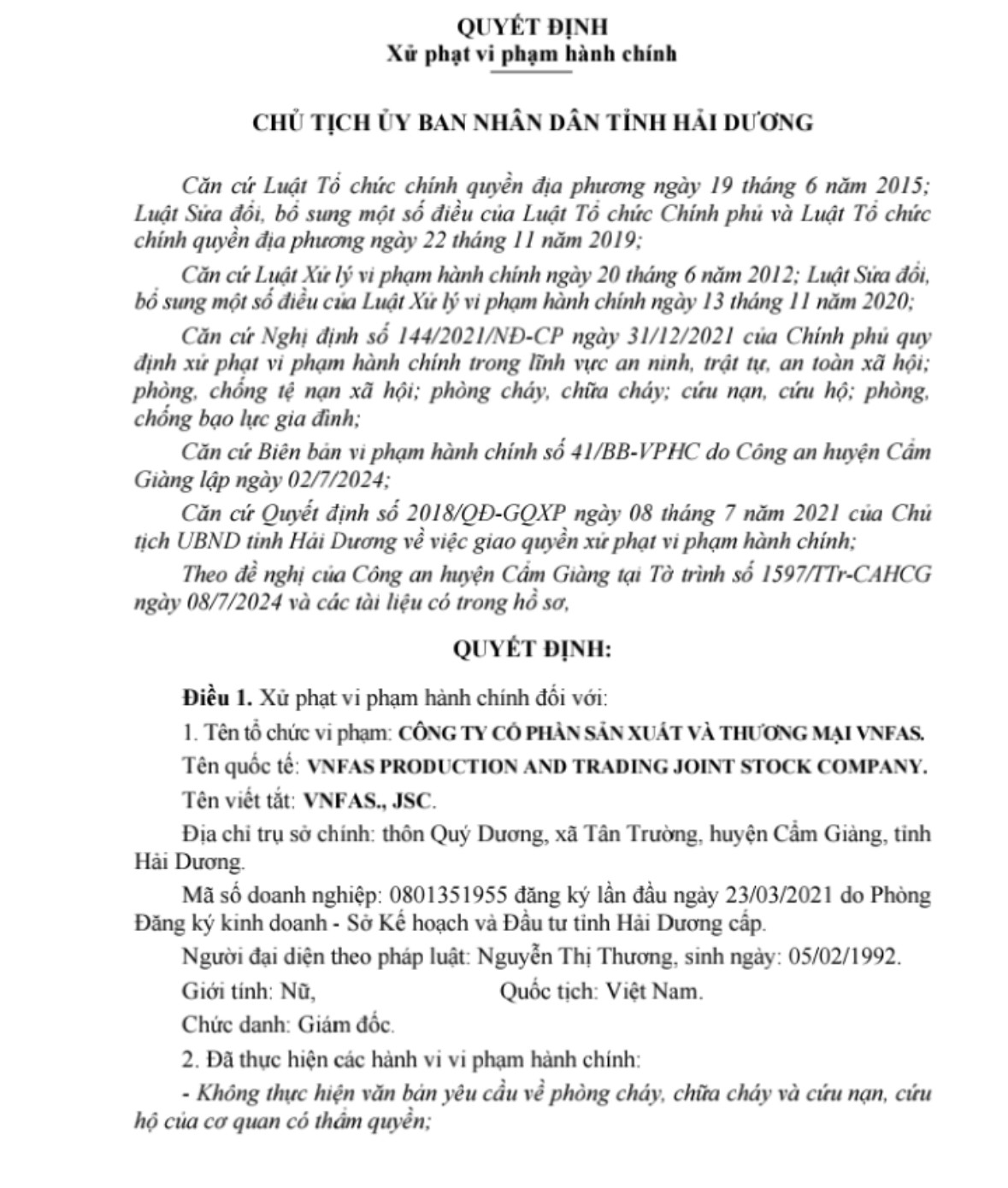 Cũng liên quan đến PCCC, tỉnh Hải Dương cũng ban hành Quyết định số 17270/QĐ-XPHC về việc xử phạt Công ty Cổ phần Sản xuất và Thương mại VNFAS (thôn Quý Dương, xã Tân Trường, huyện Cẩm Giàng, tỉnh Hải Dương). Doanh nghiệp bị xử phạt vi phạm quy định về PCCC với số tiền phạt là 88 triệu đồng do không chấp hành quyết định đình chỉ hoạt động theo quy định của pháp luật về PCCC. Tổng số tiền nộp phạt của 2 đơn vị hơn 272.000.000 đồng.