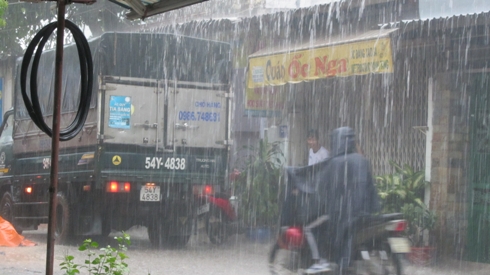 Người dân tát nước để tránh nước mưa tràn vào trong nhà.