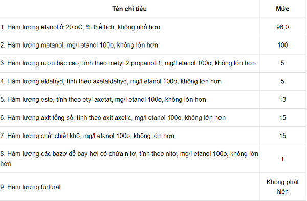 Tiêu chuẩn Quốc gia TCVN 7043:2013- Rượu trắng Cụ thể, Tiêu chuẩn này áp dụng cho các loại rượu trắng chưng cất và rượu trắng pha chế. Các nguyên liệu có nguồn gốc tinh bột và các loại đường phải đạt yêu cầu để chế biến thực phẩm. - Yêu cầu đối với cồn thực phẩm dùng làm nguyên liệu chế biến rượu trắng pha chế ![]() - Tiêu chuẩn trên cũng quy định về chỉ tiêu cảm quan như sau: ![]() - Về chỉ tiêu hóa học ![]() |