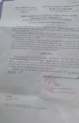 Liên hệ qua điện thoại với điều tra viên tên Dũng của Công an huyện Củ Chi, anh Dũng xác nhận: Đây là vụ việc do chính mình thụ lý. Hiện vụ việc đã được hoàn tất hồ sơ ở cấp huyện, chuyển lên Phòng CSĐT tội phạm về trật tự XH, Công an TP.HCM (PC 45) để tiếp tục điều tra, thụ lý theo thẩm quyền.