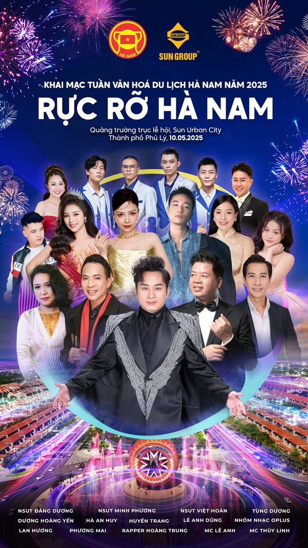 Sau hai đêm nhạc sôi động thu hút hàng nghìn lượt khách trong tháng 3, Quảng trường Công viên Lễ hội – Sun Urban City, TP. Phủ Lý sẽ tiếp tục “rực cháy” cùng Lễ khai mạc Tuần Văn hóa Du lịch Hà Nam 2025, tâm điểm là đại nhạc hội “Rực Rỡ Hà Nam”. Sự kiện do UBND tỉnh Hà Nam và Tập đoàn Sun Group phối hợp tổ chức, truyền hình trực tiếp trên sóng VTV1, Truyền hình Hà Nam và các nền tảng số của VTV vào lúc 20 giờ 10 phút, ngày 10/5/2025.