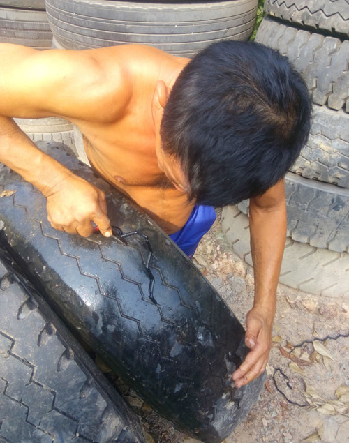 “Ở đây có nhiều loại giá từ 1,5 đến 3 triệu đồng. Muốn lấy cái nào thì lấy. Tôi còn bao luôn đắp vỏ, chạy lại gai. Nếu chạy gai thẳng thì 100.000 đồng/vỏ, chạy gai ngang 150.000 đồng/vỏ. Cần thì mua vỏ cũ rồi để lại đây tôi chạy gai cho, khoảng 1 giờ sau quay lại lấy. Đảm bảo, vỏ cũ sẽ thành như vỏ mới”, ông Bảy chắc nịch. Sau đó, ông Bảy lấy ra loại vỏ số 11 còn nguyên nhãn hiệu, nhưng mòn nhẵn, nứt nẻ rồi bảo: “Chỉ cần qua tay tôi một chút là sẽ y như mới”. Nói là làm, ông Bảy lấy ca nước pha với xà phòng rồi đổ thẳng lên vỏ xe cũ, dùng một cây sắt rất sắc bén, rồi bắt đầu chạy gai. Một tay ông Bảy vịn vào chiếc vỏ, một tay cầm thanh sắt ấn mạnh vào rãnh vỏ xe. Tay ông Bảy đưa đến đâu thì từng miếng cao su trồi lên thành từng cọng rơi xuống đất, tạo ra một đường rãnh mới, nhìn vào sẽ thấy đường gai nổi cao hơn. Chỉ trong 30 phút, vỏ xe từ chỗ mòn nhẵn thành vỏ xe “nổi gai như mới”.