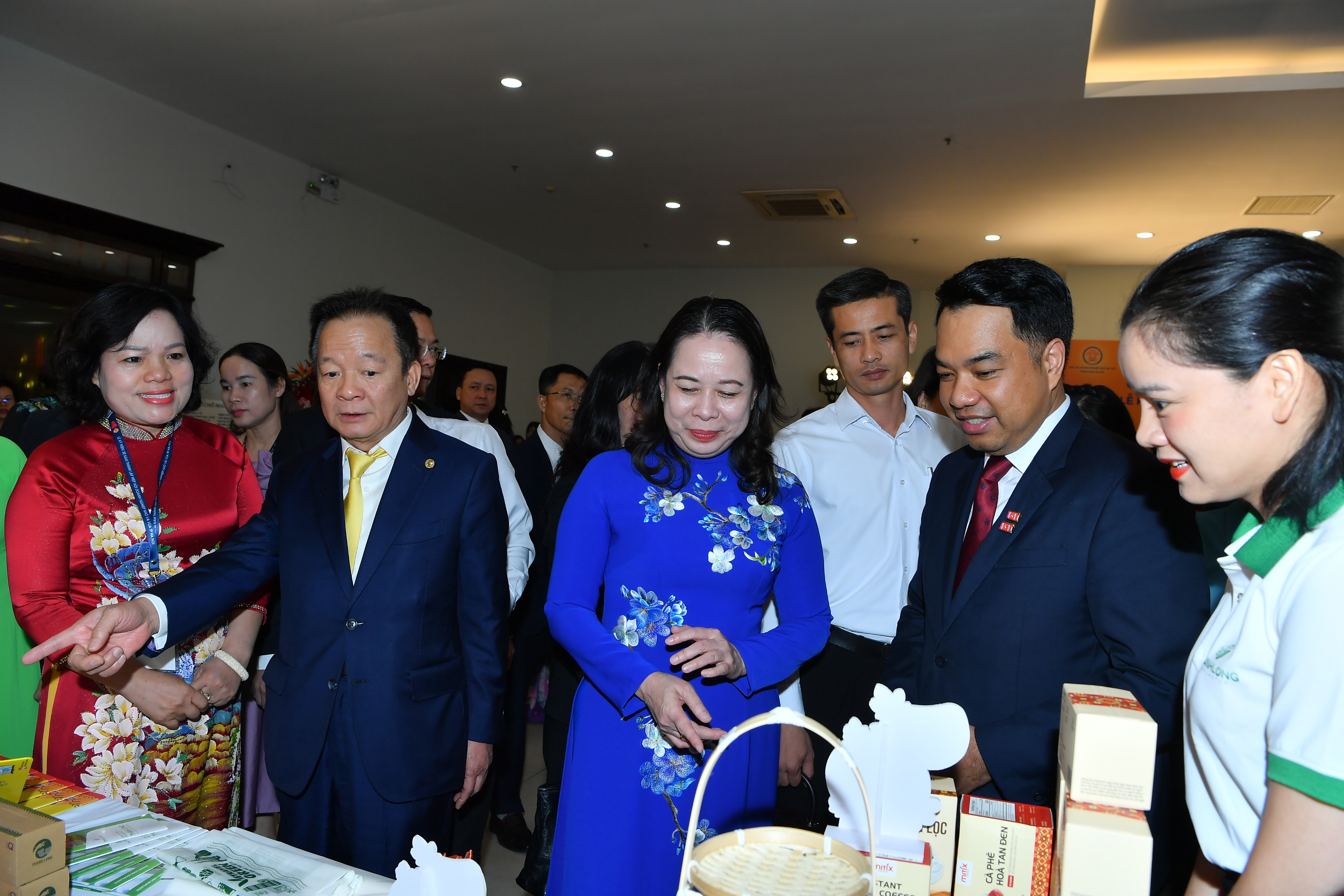 Phó Chủ tịch nước Võ Thị Ánh Xuân cùng lãnh đạo Hanoisme thăm gian trưng bày sản phẩm của các doanh nghiệp hội viên
