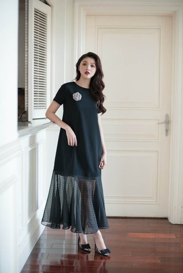 Bên cạnh đó là những hình ảnh phóng khoáng, phá cách của những chiếc váy xòe họa tiết hoa màu sắc đi kết hợp cùng những chiếc áo đen cá tính, sang trọng cũng góp phần mang đến chất mới mẻ riêng. Phóng khoáng, độc đáo nhưng vẫn giữ được thần thái thanh lịch và sang trọng là một trong những điều khó quên cho dấu ấn cá nhân.
