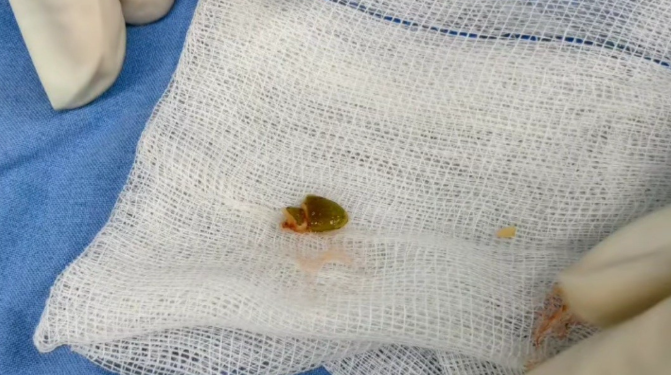 Sáng hôm sau, trong lúc vệ sinh miệng cho con, người mẹ bất ngờ phát hiện dị vật mắc trong họng miệng và lập tức đưa bé đi khám. Qua thăm khám, các bác sĩ phát hiện một đầu dị vật đã găm vào niêm mạc trong má phải. Ê-kíp nhanh chóng tiến hành gắp dị vật, xác định đó là một chiếc ghim tất kim loại sắc nhọn. Rất may, dị vật chưa trôi sâu xuống hạ họng hay thực quản, vùng niêm mạc chỉ bị xây xước nhẹ và chưa có dấu hiệu nhiễm trùng.