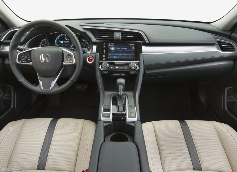 Vô-lăng với thiết kế 3 chấu quen thuộc vẫn song hành cùng Honda Civic 2016 với điểm nhấn là viền mạ crom. Trên vô-lăng bố trí đầy đủ các phím bấm điều khiển hệ thống âm thanh. Riêng phiên bản 2.0AT có thêm chế độ đàm thoại rảnh tay và lẫy chuyển số thể thao. Cụm đồng hồ có thiết kế 2 tầng lạ mắt giúp hiển thị thông tin nhiều hơn. Đồng hồ tốc độ xe và màn hình hiển thị đa thông tin được gắn ở vị trí cao. Các chế độ lái Econ Mode (tiết kiệm nhiên liệu) và Eco Coaching (hướng dẫn lái xe tiết kiệm nhiên liệu) được hiển thị rõ rang giúp người lái dễ dàng nắm bắt. Phiên bản 1.8AT sở hữu đầu CD, đài AM/FM, nghe nhạc MP3, hỗ trợ kết nối USB/AUX, hệ thống âm thanh 4 loa. Phiên bản 2.0AT được trang bị tốt hơn như đầu đĩa DVD, màn hình cảm ứng 7 inch, đài AM/FM, hỗ trợ kết nối USB/AUX, hỗ trợ kết nối Bluetooth với phím bấm điện thoại rảnh tay trên vô-lăng. Hệ thống âm thanh 6 loa...cùng rất nhiều tiện ích khác được trang bị cho Honda Civic 2016.