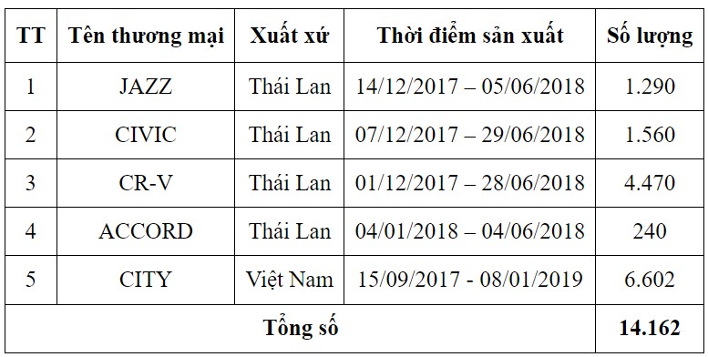 (VietQ.vn) - Công ty Honda Việt Nam (HVN) vừa thông báo triệu hồi 14.162 ôtô gồm các mẫu Jazz, Civic, CR-V, City và Accord để kiểm tra, thay thế bơm nhiên liệu bị lỗi.