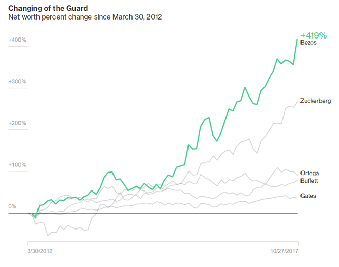Khi mới đưa Amazon lên sàn chứng khoán, tài sản của Bezos chỉ là 178 triệu USD tính theo phần ông này sở hữu ở Amazon. Nhưng đến nay, khối tài sản nhỏ bé ngày nào đã phình to thành 88 tỷ USD. So với top 5 tỷ phú giàu nhất thế giới hiện tại, Jeff là người có sự bứt tốc tốt nhất khi chỉ sau 5 năm đã tăng tới 419%.