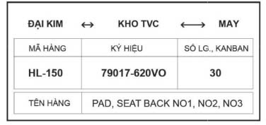 Trên Kanban thường chứa những thông tin như: Tên chi tiết, sản phẩm được sản xuất; Sức chứa của thùng Kanban; Địa chỉ, ký hiệu của quy trình làm việc trước; Địa chỉ, ký hiệu của quy trình như hình dưới đây: