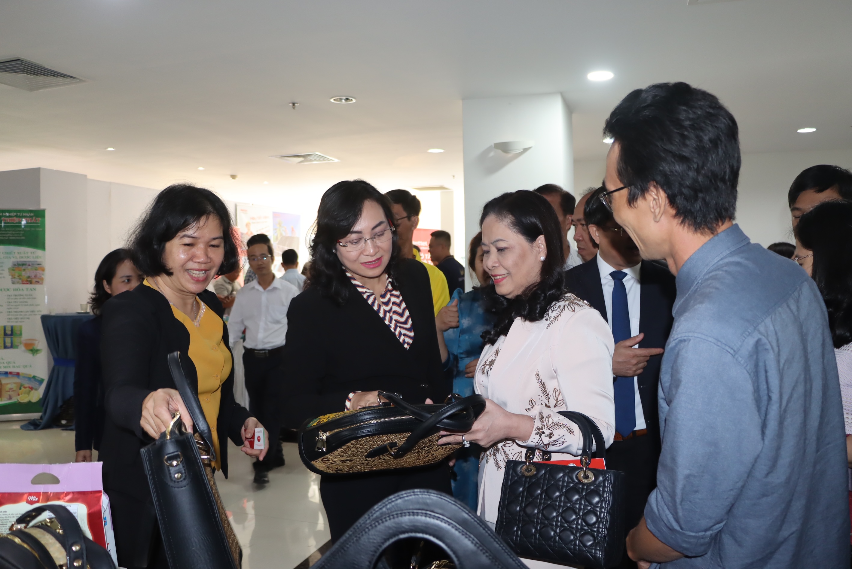 Lãnh đạo và đoàn đại biểu tham gian các gian hàng trưng bày sản phẩm đặc trưng trong nước.