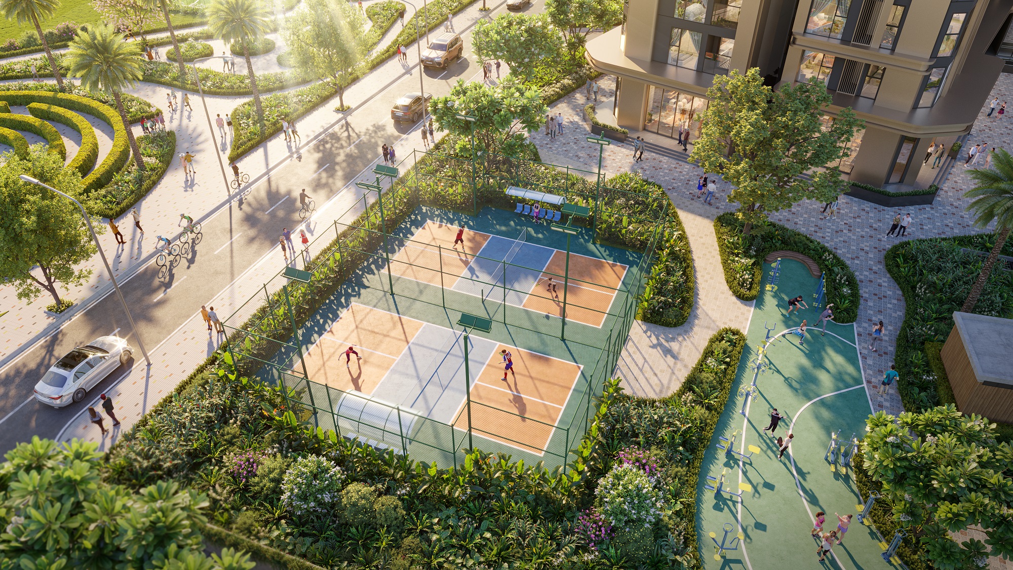 Sân thể thao ngoài trời hòa cùng không gian xanh mướt của nội khu dự án