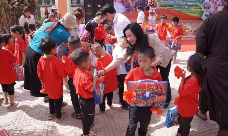 Tổng Giám đốc Ngô Thu Hà và đoàn cán bộ nhân viên SHB đã trao tặng 2.000 suất quà gồm cặp sách và đồ dùng học tập tới các em học sinh của hai trường.“Với hai công trình lớp học này, SHB mong muốn những trẻ em đồng bào dân tộc thiểu số tại tỉnh Điện Biên có cơ hội học tập trong điều kiện cơ sở vật chất khang trang, hiện đại hơn. Đó sẽ là động lực để các em nỗ lực phấn đấu, vượt qua những khó khăn trở ngại, tiếp tục nuôi dưỡng ước mơ và trở thành những công dân có ích cho quê hương, đất nước”, Tổng Giám đốc SHB Ngô Thu Hà chia sẻ tại sự kiện.