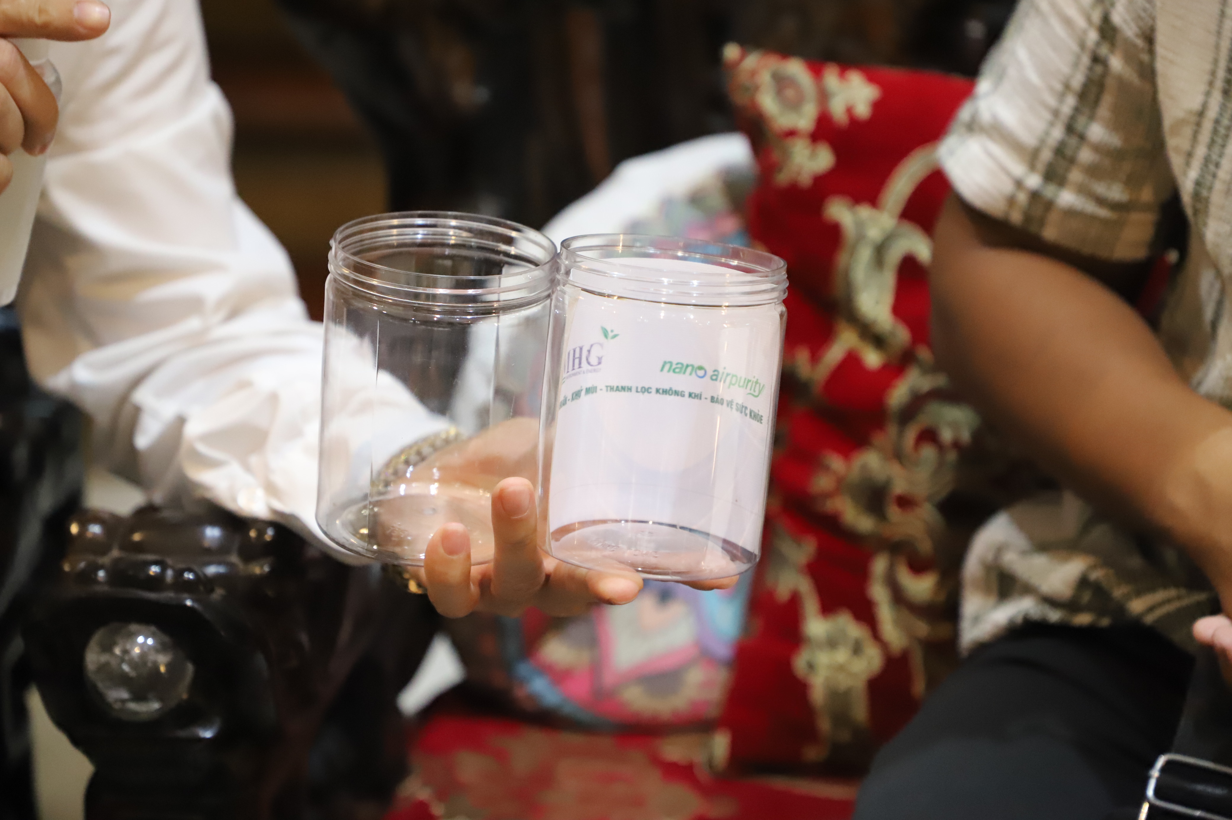 Ông Trần Công Hoà thử nghiệm công nghệ Nano Airpurity khả năng kháng khuẩn, khử mùi, làm sạch không khí trong 2 chiếc lọ (bên phải là lọ trống, bên trái là lọ có tấm vải công nghệ Nano Airpurity).