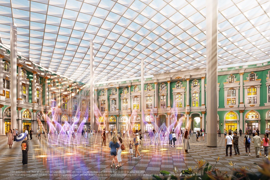 Tâm điểm của tổ hợp là không gian công cộng và tổ chức sự kiện, thuơng mại trong nhà dành cho cư dân khu đô thị và du khách hiện đại bậc nhất Quảng NinhTổ hợp lấy cảm hứng thiết kế từ cung điện châu Âu sang trọng, với các chi tiết phủ vàng thủ công, mang lại cảm hứng sống hoàng gia sang trọng cho cư dân Móng Cái. Tâm điểm của tổ hợp là không gian công cộng và tổ chức sự kiện trong nhà với phần mái vòm kính lớn lên tới 4.600m2 trang trí ánh sáng LED hiện đại. Tại đây, du khách có thể vừa tự do dạo bộ thư giãn, vừa hòa mình vào những hoạt động đặc sắc được tổ chức quanh năm. Công trình điểm nhấn này là đại diện cho thương hiệu đô thị Việt thế hệ mới tinh hoa, văn minh và giàu bản sắc.