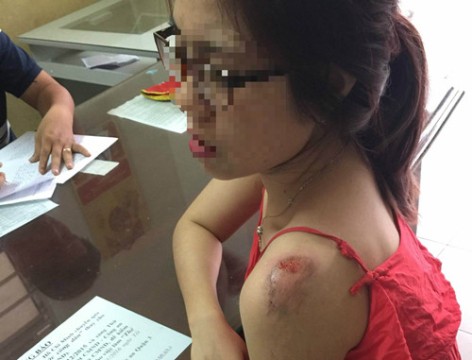 Chị Huyền với vai bị trầy xước do bị kéo lê một đoạn đường dài trên đường - ảnh: Hoa Dại.