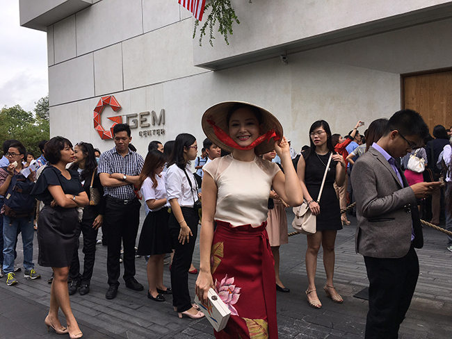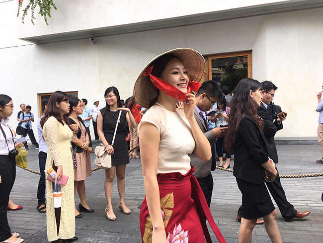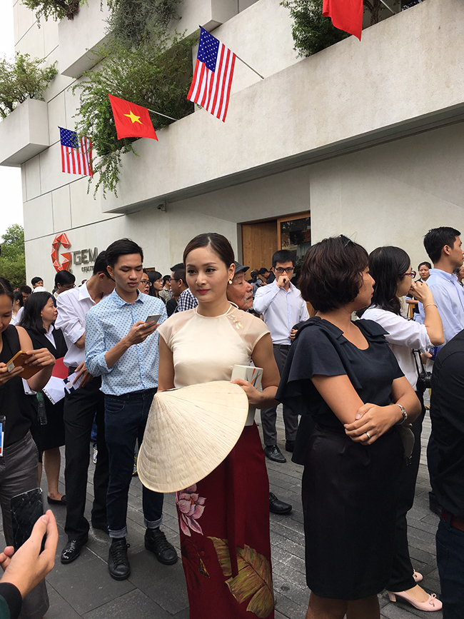 Sáng nay (25/5), trước của trung tâm Gem Center, TPHCM, sứ giả thiện chí Lan Phương đã có mặt trong buổi trò chuyện cùng tổng thống Mỹ Obama. Diễn viên Lan Phương chọn trang phục có hoạ tiết dân gian hình hoa sen và áo yếm truyền thống cách điệu.