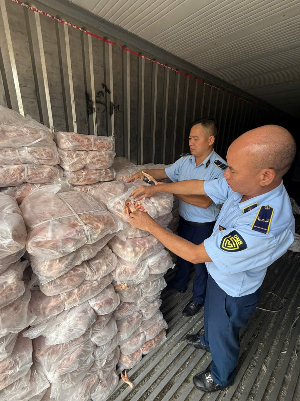 Cũng trong thời gian này, Đội QLTT số 05, Chi cục QLTT tỉnh Lào Cai đã thực hiện khám container, phát hiện 1.560kg chân gà đông lạnh không nhãn mác, không thể hiện xuất xứ, không có số lô sản xuất.