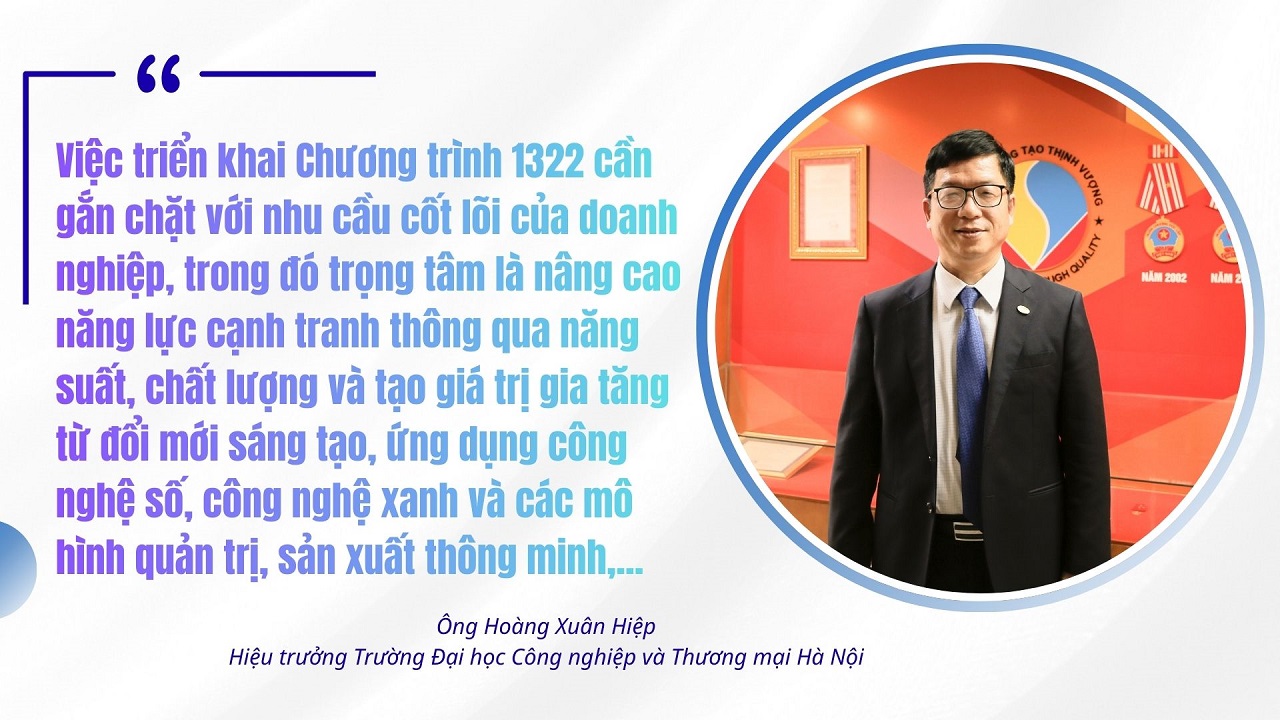 Ngoài ra, ông Hoàng Xuân Hiệp - Hiệu trưởng Trường Đại học Công nghiệp và Thương mại Hà Nội cũng cho rằng, phải gắn chặt việc triển khai Chương trình 1322 với nhu cầu thực tế của doanh nghiệp. Trong đó, nhu cầu cốt lõi của doanh nghiệp chính là nâng cao năng lực cạnh tranh bằng năng suất, chất lượng, tạo ra giá trị gia tăng cao thông qua các hoạt động đổi mới sáng tạo như phát triển sản phẩm tái chế; ứng dụng công nghệ số, công nghệ xanh vào quy trình sản xuất; ứng dụng hệ thống quản lý thông minh dựa trên nền tảng IoT, dữ liệu lớn và trí tuệ nhân tạo (AI); đổi mới mô hình sản xuất kinh doanh theo chuỗi,…