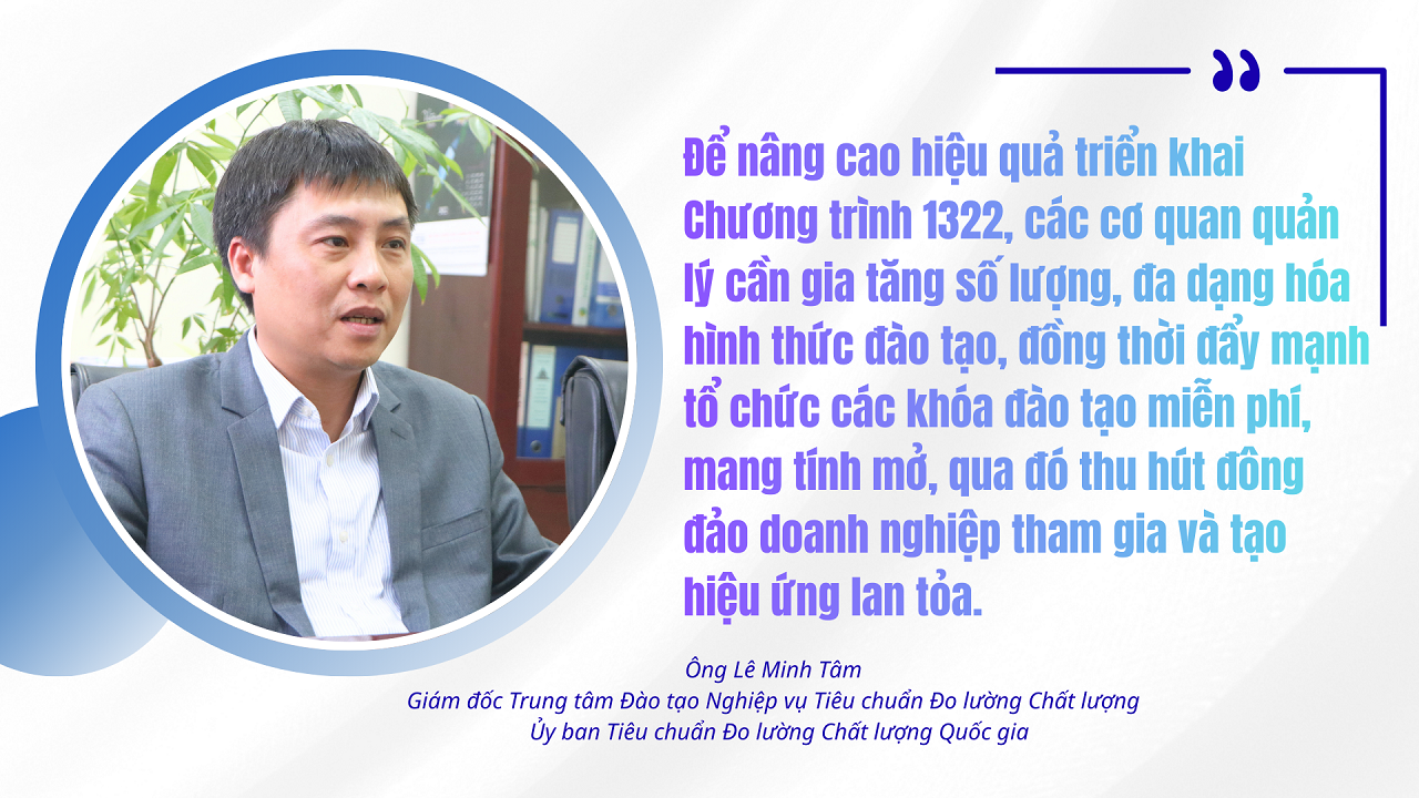 Để Chương trình 1322 tiếp tục lan tỏa sâu rộng và hiệu quả hơn, ông Lê Minh Tâm nhấn mạnh sự cần thiết phải gia tăng số lượng cũng như đa dạng hóa các chương trình đào tạo, từ nâng cao nhận thức đến hướng dẫn triển khai cụ thể tại doanh nghiệp. Theo ông, cơ quan quản lý cần đẩy mạnh tổ chức các khóa đào tạo miễn phí, có tính mở, nhằm thu hút sự tham gia rộng rãi của cộng đồng doanh nghiệp, qua đó tạo hiệu ứng lan tỏa mạnh mẽ.