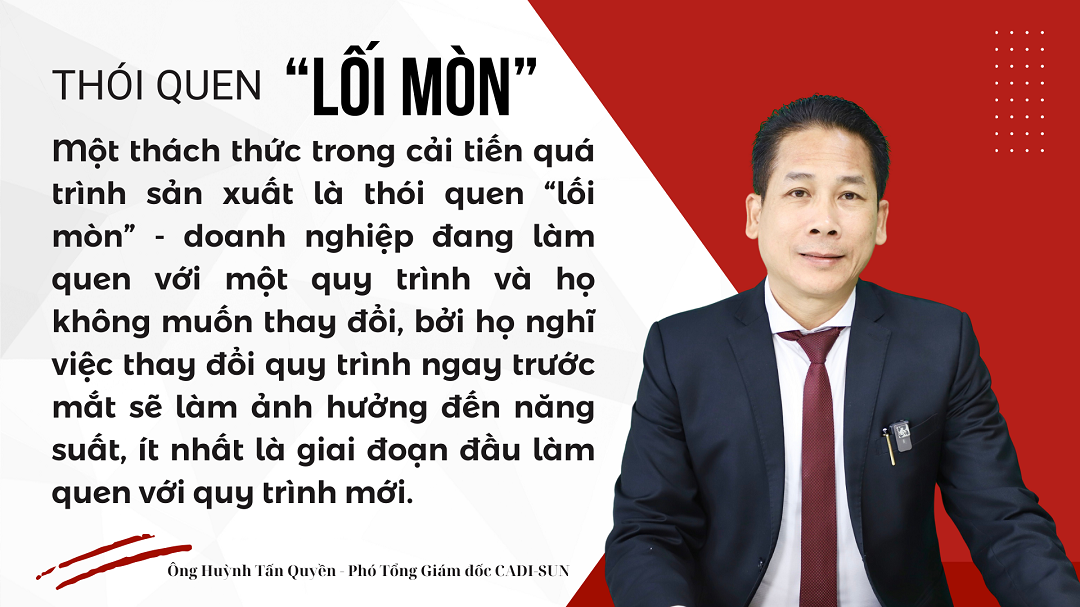 Chia sẻ về một số biện pháp doanh nghiệp đã áp dụng để cải thiện năng suất lao động và nâng cao chất lượng sản phẩm, ông Huỳnh Tấn Quyền - Phó Tổng Giám đốc CADI-SUN cho biết, ngoài việc duy trì hệ thống ISO giúp cải tiến và liên tục nâng cao chất lượng để sản phẩm có được giá cạnh tranh, CADI-SUN đã áp dụng công cụ cải tiến Kaizen (cải tiến để tốt hơn), công cụ 5S (Sàng lọc, Sắp xếp, Sạch sẽ, Săn sóc, Sẵn sàng), từ đó triển khai toàn bộ hệ thống và tạo ra động lực cho người lao động.