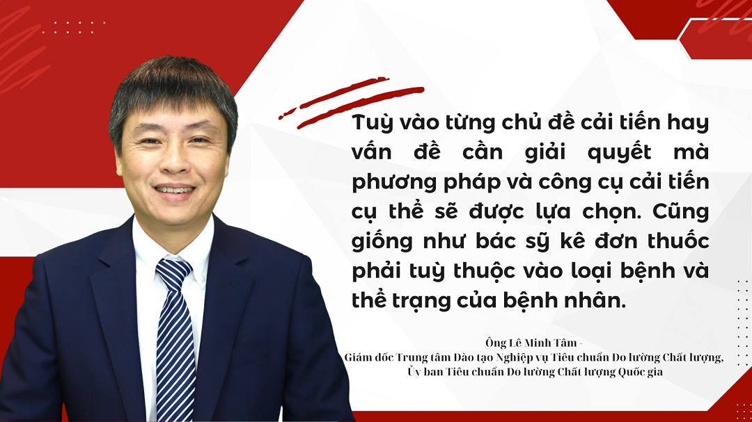(VietQ.vn) - Ông Lê Minh Tâm - Giám đốc Trung tâm Đào tạo Nghiệp vụ Tiêu chuẩn Đo lường Chất lượng, Ủy ban Tiêu chuẩn Đo lường Chất lượng Quốc gia, Chuyên gia Năng suất cho biết, cải tiến quá trình sản xuất và quản lý chất lượng đều hướng đến mục tiêu cuối cùng là nâng cao năng suất chất lượng. Tuỳ vào từng chủ đề cải tiến hay vấn đề cần giải quyết mà phương pháp và công cụ cụ thể sẽ được lựa chọn. Cũng giống như bác sỹ kê đơn thuốc phải tuỳ thuộc vào loại bệnh và thể trạng của bệnh nhân.