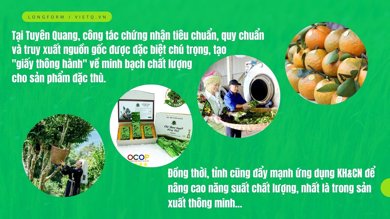 (VietQ.vn) - Tuyên Quang đang từng bước chuyển mình trong phát triển kinh tế vùng cao bằng việc đẩy mạnh áp dụng các công cụ cải tiến năng suất và tiêu chuẩn chất lượng vào sản xuất. Thông qua việc đổi mới quy trình, nâng cao hiệu quả quản lý và ứng dụng khoa học công nghệ, nhiều sản phẩm đặc trưng của tỉnh như chè Shan tuyết, cam Hàm Yên, mật ong, dược liệu… ngày càng khẳng định vị thế trên thị trường, hướng tới các chuỗi phân phối hiện đại và xuất khẩu.