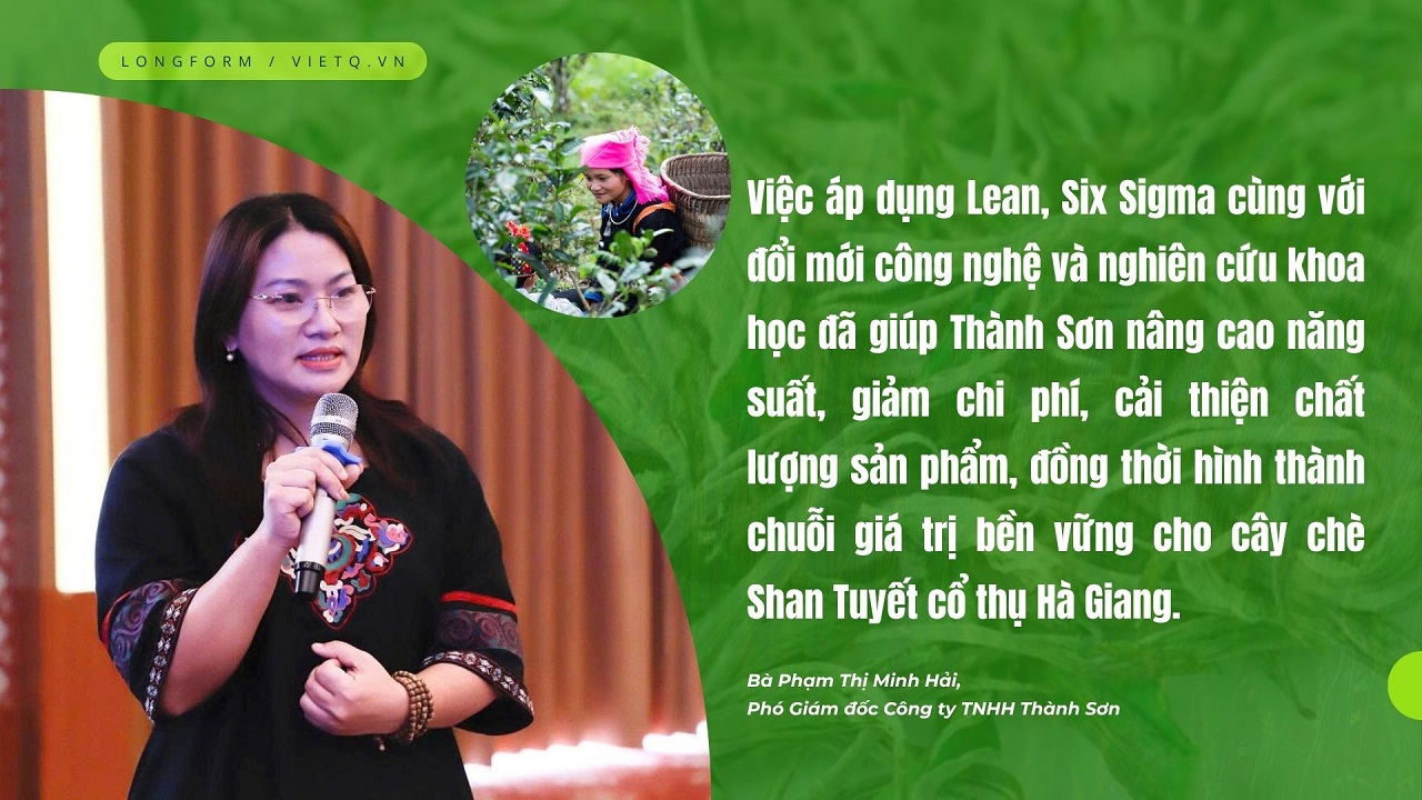 Bà Phạm Thị Minh Hải nhấn mạnh: “Việc áp dụng Lean, Six Sigma cùng với đổi mới công nghệ và nghiên cứu khoa học đã giúp Thành Sơn nâng cao năng suất, giảm chi phí, cải thiện chất lượng sản phẩm, đồng thời hình thành chuỗi giá trị bền vững cho cây chè shan tuyết cổ thụ Hà Giang. Từ cây chè shan tuyết Tây Côn Lĩnh – món quà quý của thiên nhiên chúng tôi tạo ra những sản phẩm tinh túy, mang giá trị văn hóa và tự nhiên của vùng cao đến với người tiêu dùng trong nước và quốc tế, góp phần bảo tồn, phát huy nguồn tài nguyên quý cho các thế hệ mai sau".