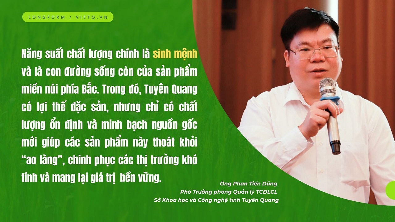 Ông Phan Tiến Dũng - Phó Trưởng phòng Quản lý Tiêu chuẩn Đo lường Chất lượng - Sở Khoa học và Công nghệ tỉnh Tuyên Quang cho biết, năng suất chất lượng chính là sinh mệnh và là con đường sống còn của sản phẩm miền núi phía Bắc nói chung và Tuyên Quang nói riêng. Tuyên Quang có lợi thế đặc sản, nhưng chỉ có chất lượng ổn định và minh bạch nguồn gốc mới giúp các sản phẩm này thoát khỏi “ao làng”, chinh phục được các thị trường khó tính và mang lại giá trị gia tăng bền vững.