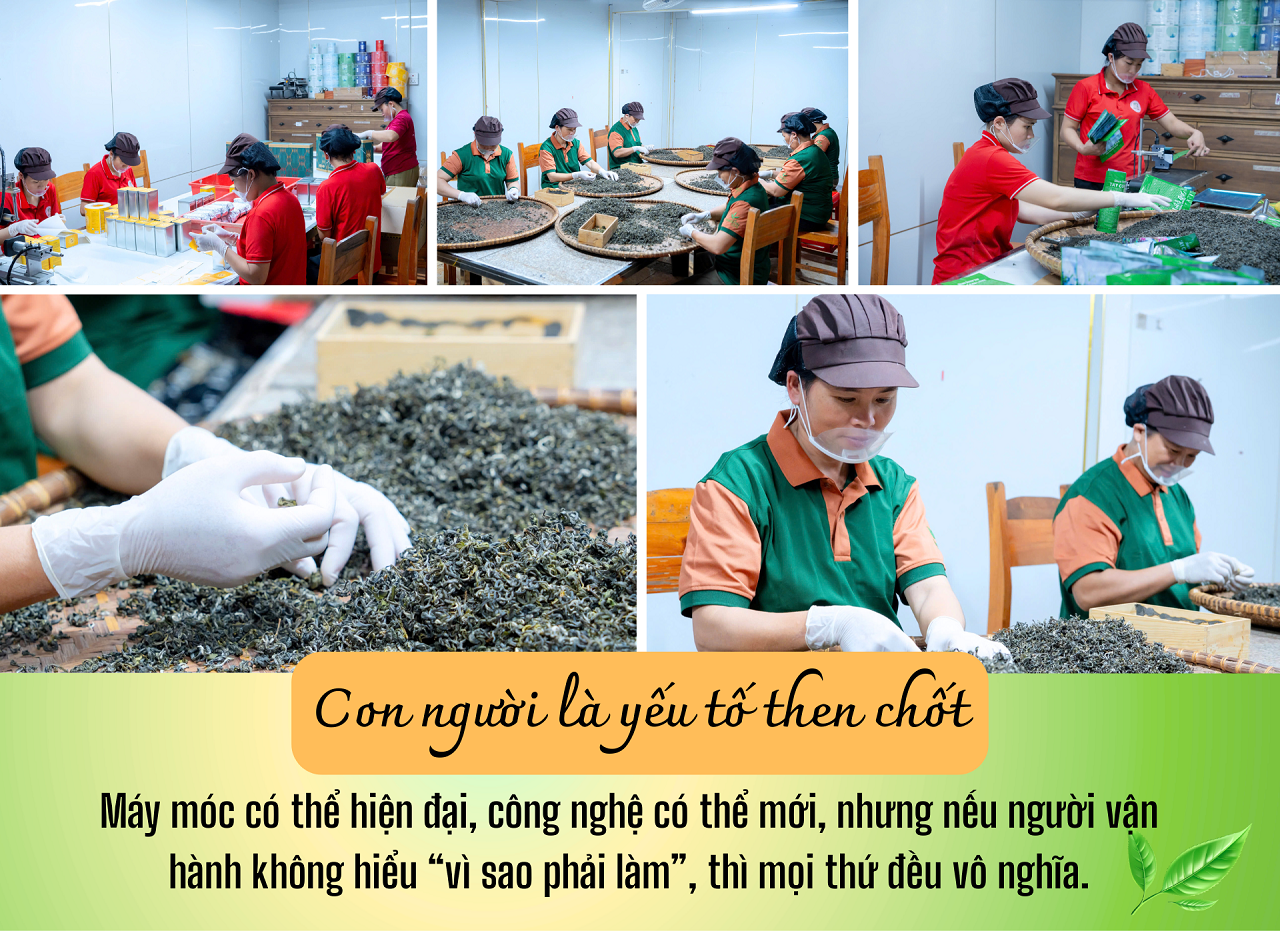 Ví dụ cụ thể là khâu sấy trà và bảo quản nguyên liệu. Trước đây, việc sấy được làm thủ công, không đồng nhất nhiệt độ, khiến độ ẩm sản phẩm dao động lớn - có khi 7%, có khi 10%, ảnh hưởng trực tiếp đến hương vị và hạn sử dụng.